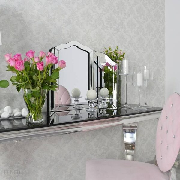 Srebrne lustro glamour stojące na toaletkę o wymiarach 77.4×53.8 cmPotrójne lustro w stylu glamour, które idealnie będzie prezentować się na toaletce.Lustro składa się z trzech części: lustra głównego i dwóch mniejszych, bocznych luster, dzięki którym twarz jest dokładnie widoczna z każdej strony. Taki układ lustra wygodny jest podczas wykonywania makijażu bądź podczas codziennej pielęgnacji cery. Delikatnie falujący kształt ramy lustra dodaje mu finezji i lekkości, a lustrzana rama okalająca taflę lustra optycznie powiększa pomieszczenie.Parametry lustra:- sposób montażu: stojące- szerokość x wysokość: 77,4 x 53,8 cm- grubość ramy: 15 mm- szerokość ramy: 3,5 cm- grubość tafli lustra: 5 mm- krawędź lustra: faza- wykończenie krawędzi lustra: mat- waga: 5,3 kg