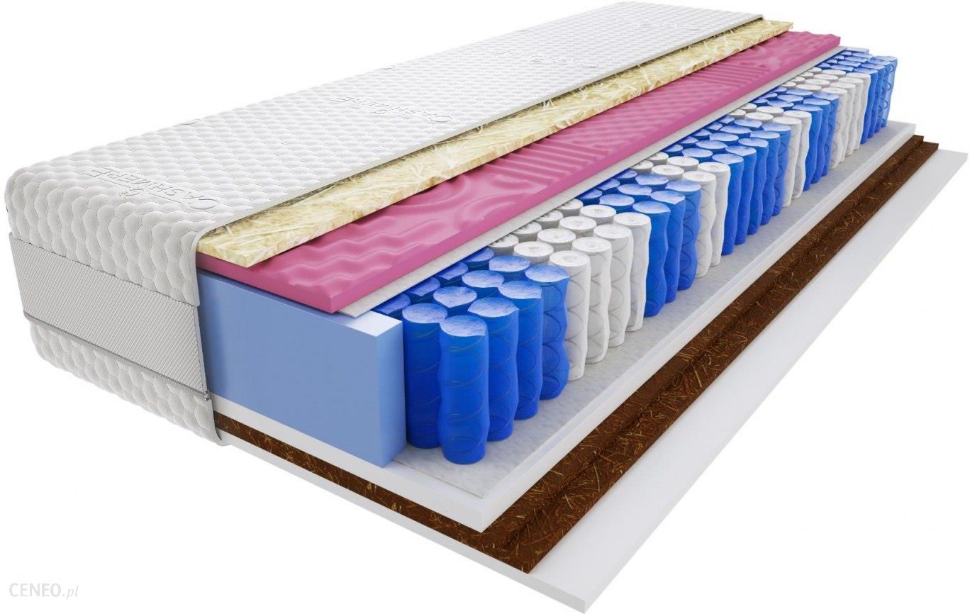 Materac Pers Molet to materac dwustronny, jedna ze stron to strona bardzo twarda, druga średniotwarda. Polecamy go dla osób, których waga pojedynczej osoby nie przekracza 100 kg (strona średniotwarda) lub dla osób, których waga pojedynczej osoby przekracza 120kg (strona bardzo twarda). Materac Pers to nasz bazowy model z półki materacy średniotwardych/bardzo twardych.Materac posiada 9 stref twardości doskonale dopasowując się do ciałaObie strony materaca nadają się do spania – materac jest dwustronnyJedna strona materaca jest bardzo twardaJedna strona materaca jest średniotwardaPikowany laserowo kaszmirowy pokrowiec z siatką wentylującą 3D. Kolor pokrowca: biały. Kolor siatki 3D – szara w kolorze napisu CashmereSprężyny kieszeniowe pocketowe 262szt/m2 – zapewniają doskonałą elastyczność punktowąPianka poliuretanowa T25 o gęstości 25kg/m3 (dobra twardość, dobra sprężystość) otaczająca materac po bokach2x Kokos – gramatura 1300g/m2 – utwardza materac, znakomicie przepuszcza powietrze przez co zapobiega nadmiernemu poceniu sięNasze materace można używać w łóżkach z regulowanym stelażemPianka HR – do 45% trwalsza niż pianka T25. Zapewnia dużo lepsze dopasowanie do kształtu ciała, zwiększa wygodę i komfort snu w porównaniu do zwykłej piankiPokrowiec posiada zamek w kształcie litery L co ułatwia jego ściągnięcie i wypranie w pralceMaterac posiada funkcję lato/zima – z jednej strony włókno klimatyzujące, z drugiej owcza wełnaMaterac jest hypoalergiczny – zminimalizowane jest ryzyku występienia uczuleń i alergiiPianka moletowana – nowoczesna 7 strefowa profilowana piankaPokrowiec kaszmirowy- ekskluzywny, gruby (gramatura 450g/m2), ciepły pokrowiec o dużej zawartości szlachetnej wełny kaszmirowej. Wełna ta pozyskiwana jest z wełny kóz kaszmirskich poprzez ręczne wyczesywanie, a następnie rozdzielanie włosia zewnętrznego od puchowego. Pokrowiec jest wyjątkowo puszysty, mięsisty i przyjemny w dotyku. Pikowany laserowo, tzn. zachowuje wszystkie właściwości pokrowca pikowanego plus nie jest połączony z owatą (jak ma to miejsce w przypadku normalnego pikowania) przez co zmieści się do każdej pralki i można go bezproblemowo prać. Ma funkcję lato/zima – po jednej stronie materaca jest owcza wełna (zima), a po drugiej włókno klimatyzujące (lato). Dodatkowo przeszyty z boku siatką wentylującą 3D co jeszcze bardziej podnosi trwałość i przewiewność materaca – siatka ta pozwala jeszcze lepiej wentylować materac. Pokrowiec posiada zamek w kształcie litery L co oznacza, ze zamek mieści się na dwóch sąsiadujących bokach materaca – ułatwia to jego zdejmowanie i zakładanie.Pianka HR– pianka wysokoelastyczna o gęstości 35kg/m3 – używana w naszych materacach bezpośrednio nad filcem nad i pod sprężynami kieszeniowymi. Do 45% trwalsza niż pianka poliuretanowa. Zapewnia dużo lepsze dopasowanie do kształtu ciała, zwiększa wygodę i komfort snu w porównaniu do zwykłej pianki. Pianka HR zapewnia optymalną przepuszczalność powietrza – zbudowana z porowatej struktury komórkowej – gwarantuje doskonałą wentylację materaca, tym samym podnosi jego trwałość.Pianka profilowana moletowana- nowoczesna pianka posiadająca 7 stref. Pianka zbudowana jest z szeregu następujących po sobie wgłębień i wypustek. Poprawia to wentylację materaca oraz zapewnia idealne dopasowanie materaca do powierzchni ciała. Pianka profilowana moletowana to pianka o dużej gęstości, zapewnia bardzo dobrą odporność na odkształcenia oraz poprawia krążenie krwi.2x Kokos- zwiększona gramatura – 1300g/m2 powoduje, że materac staje się twardy, dzięki czemu jego odporność na odkształcenia jest dużo większa. Naturalny surowiec wykonany ze skorupy orzecha kokosowego, antyalergiczny oraz antygrzybiczny. Warstwa kokosowa znakomicie przepuszcza powietrza przez co zapobiega nadmiernemu poceniu się. Materace z warstwą kokosową polecamy dla osób, których waga jednej osoby zaczyna się od 100 kg.Sprężyny kieszeniowe 9 stref (262szt/1m2)- wszystkie nasze materace zbudowane są ze sprężyn kieszeniowych. Sprężyny kieszeniowe to zbiór pojedynczych sprężyn, każda z nich jest umieszczona w osobnym materiale, tzw. kieszeni. Dzięki temu nie słychać pracy sprężyn oraz wyeliminowany jest problem zsuwającej się osoby lżejszej na cięższą jak to ma miejsce w przypadku sprężyn bonellowych. Nasze materace posiadają 9 stref twardości zapewniając optymalne podparcie całego ciała. Miększe sprężyny stosowane w miejscu w którym nacisk ciała jest większy, np. w okolicach bioder. Twardsze sprężyny stosowane są w miejscach w których nacisk jest mniejszy jak np. odcinek lędźwiowy. Zainwestuj w materac klasy premium, który zagwarantuje zdrowy i wygodny wypoczynek.Filc (inaczej przekładka tapicerska)- oddziela sprężyny kieszeniowe od materaca, wzmacnia jego wytrzymałość. Zastosowanie filcu powoduje, że materaca nie można zrolować nie powodując uszkodzeń sprężyn.Owata (inaczej włókno klimatyzujące)- materiał zapewniający bardzo dobrą wentylację materaca oraz zwiększający jego wytrzymałość. W naszych materacach zawsze połączona z materacem – nie zwiększająca grubości kaszmirowego pokrowca mimo jego pikowania laserowego.Owcza Wełna- naturalny materiał posiadający właściwości grzewcze stosowany w każdym z naszych materacy – pochłania on ciepło wydzielane przez osobę śpiącą i zatrzymuje je w sobie. Zalecamy spanie po stronie z owczą wełną w okresie jesienno-zimowym.Pianka T25- pianka poliuretanowa o gęstości 25kg/m3 (dobra twardość, dobra sprężystość) otaczająca materac po bokach. Pianka o ograniczonej odporności na wygniatanie.